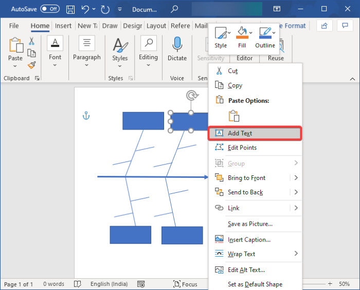 Sekarang, Anda harus memasukkan teks untuk menentukan masalah utama dan penyebabnya. Untuk itu, klik kanan pada bentuk panah segi lima dan pilih opsi Add Text untuk mendefinisikan masalah utama. Masukkan teks Anda dan format sesuai kebutuhan Anda. Lakukan hal yang sama dengan bentuk persegi panjang untuk menjelaskan penyebab dalam diagram Anda.