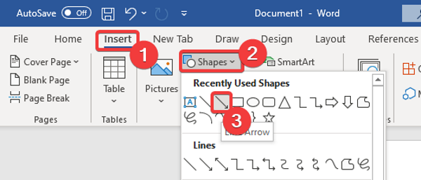 Sekarang, kita harus menyiapkan struktur dasar diagram tulang ikan Anda. Untuk itu, buka tab Sisipkan( Insert) dan dari tab Ilustrasi( Illustration) , klik opsi drop-down Shape dan pilih bentuk Line Arrow . Tambahkan bentuk ini ke tengah dokumen.