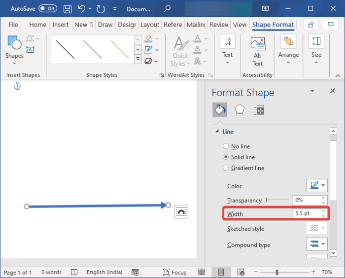 Sekarang, klik kanan pada bentuk dan klik pada opsi Format Shape yang akan membuka panel Format Shape di sebelah kanan. Dari sini, tambah lebar panah garis.