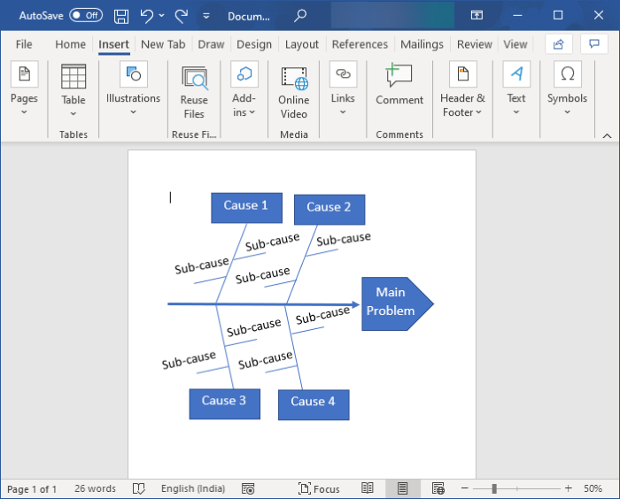 Pada artikel ini, kita akan berbicara tentang bagaimana Anda dapat membuat diagram tulang ikan dalam dokumen Word . Diagram Fishbone(Fishbone diagram) alias Diagram Ishikawa(Ishikawa Diagram) alias Diagram Penyebab dan Akibat (Cause and Effect Diagram ) digunakan untuk bertukar pikiran dan mewakili potensi penyebab masalah dalam kerangka kerja Anda. Tulang ikan pada dasarnya menggambarkan penyebab dengan tubuh bagian atas menunjukkan efek atau masalah. Hal ini terutama digunakan dalam akar penyebab dan analisis masalah di banyak industri.